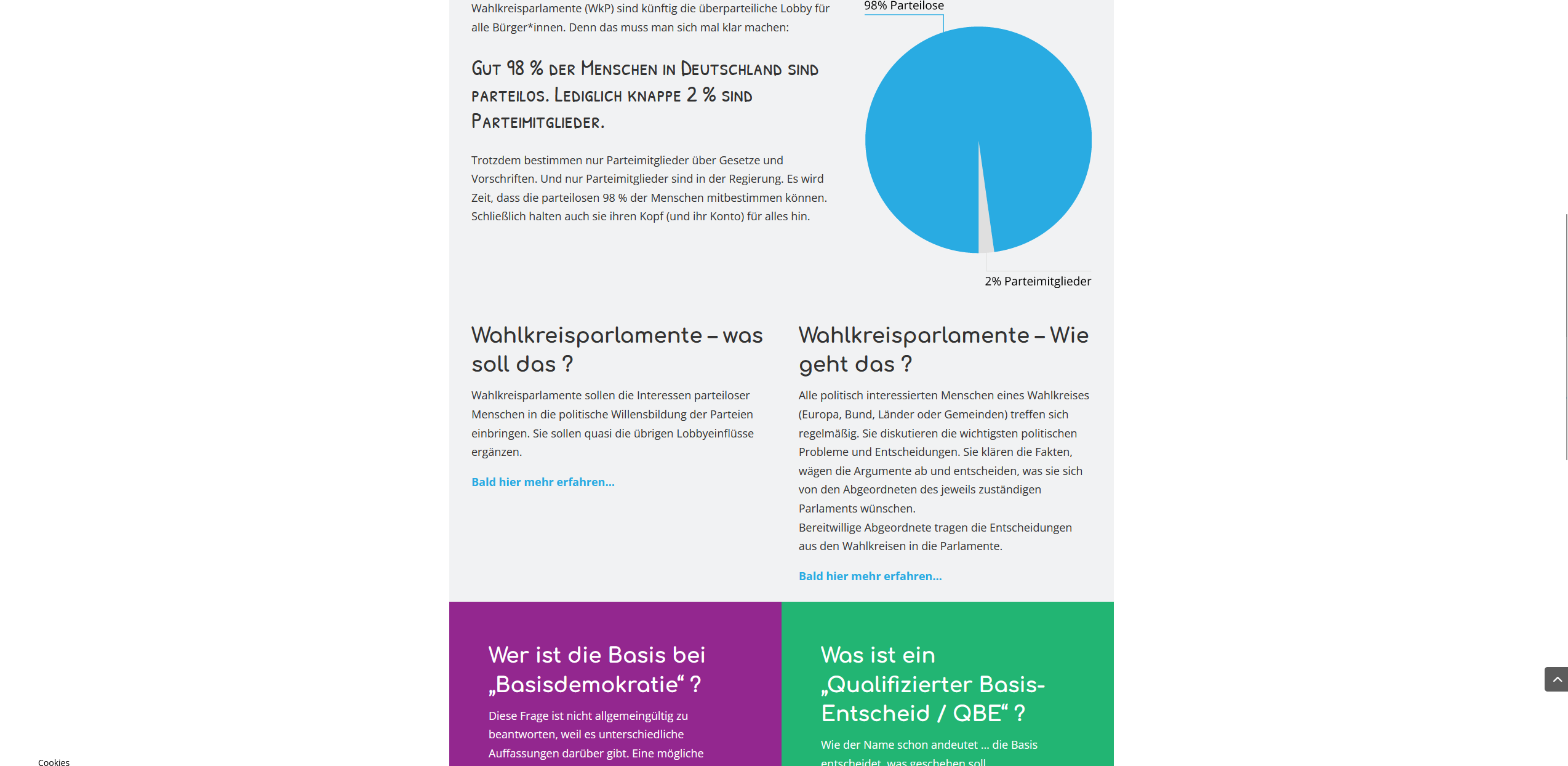 ‚wir98‘ … wollen eine Bürgerbewegung, welche die 98 % parteilosen Menschen in Deutschland davor bewahren soll, autoritär ‚von oben‘ regiert zu werden … mit anderen Worten: Bürgerdemokratie statt Parteiendemokratie.